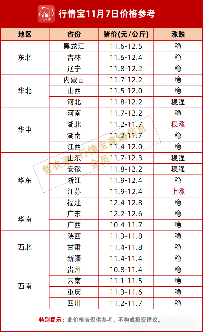 猪价连跌8日。9个省份均价下跌,8个上涨,其他持稳。最低价贵州11.06元/公斤,最高价福建12.60元/公斤。广东跌幅最大,环比下跌0.22元/公斤。