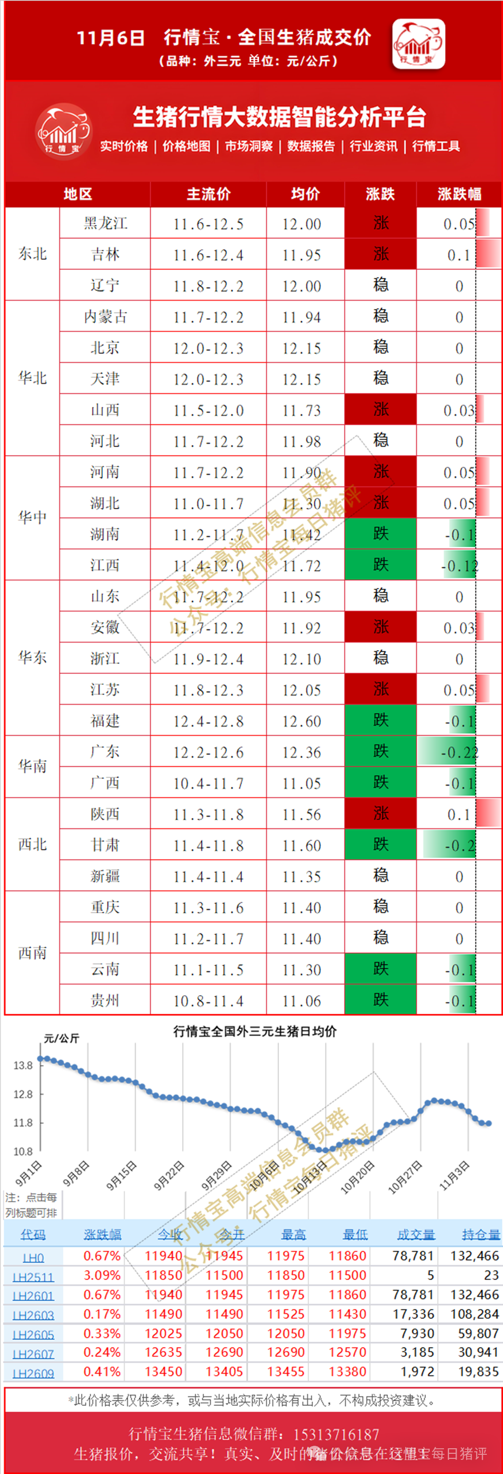 11月6日数据显示,全国生猪均价为11.79元/公斤,较前一日下跌0.02元/公斤,月环比上涨0.6%,同比下跌30.8%。
