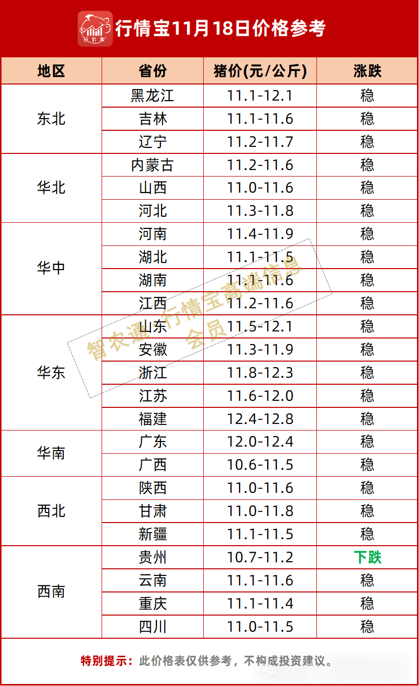 11月17日数据显示,全国生猪均价为11.54元/公斤,较昨日下跌0.09元/公斤,较上周五下跌0.17元/公斤,月环比上涨3.5%,同比下跌28.1%。猪价持续下跌。18个省份均价下跌,无上涨省份,其他持稳。最低价贵州和广西11.00元/公斤,最高价福建12.55元/公斤。东北地区跌幅最大,环比下跌0.20元/公斤;南方主稳。