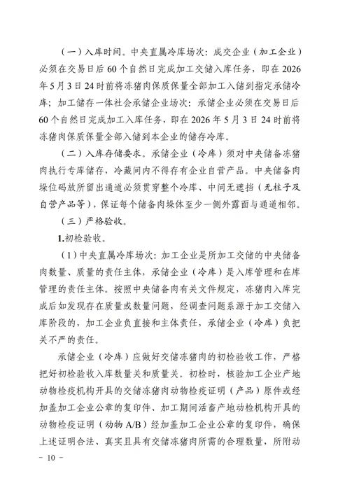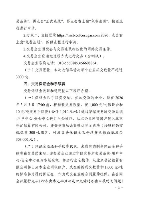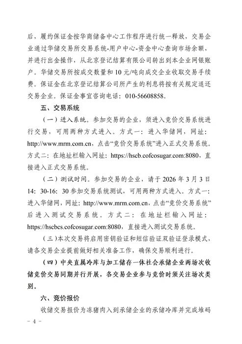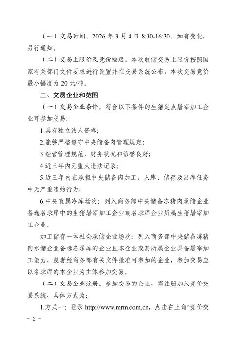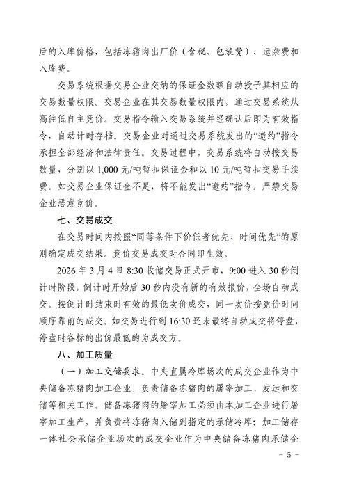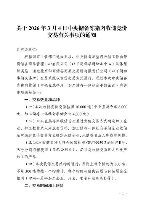关于2026年3月4日中央储备冻猪肉收储竞价交易有关事项的通知