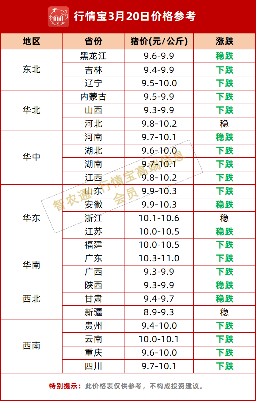 3月19日智农通APP行情宝数据显示,今日全国生猪均价为10.01元/公斤,较昨日下跌0.07元/公斤,月环比下跌8.2%,同比下跌32.3%。21个省份均价下跌,无上涨省份。最低价新疆9.10元/公斤,最高价广东10.77元/公斤。湖南跌幅最大,环比下跌0.15元/公斤。市场核心特征在于“挺价情绪松动”,养殖端抗跌心理转变,集团化猪企出栏节奏调整,多区域出现降价走货现象。
