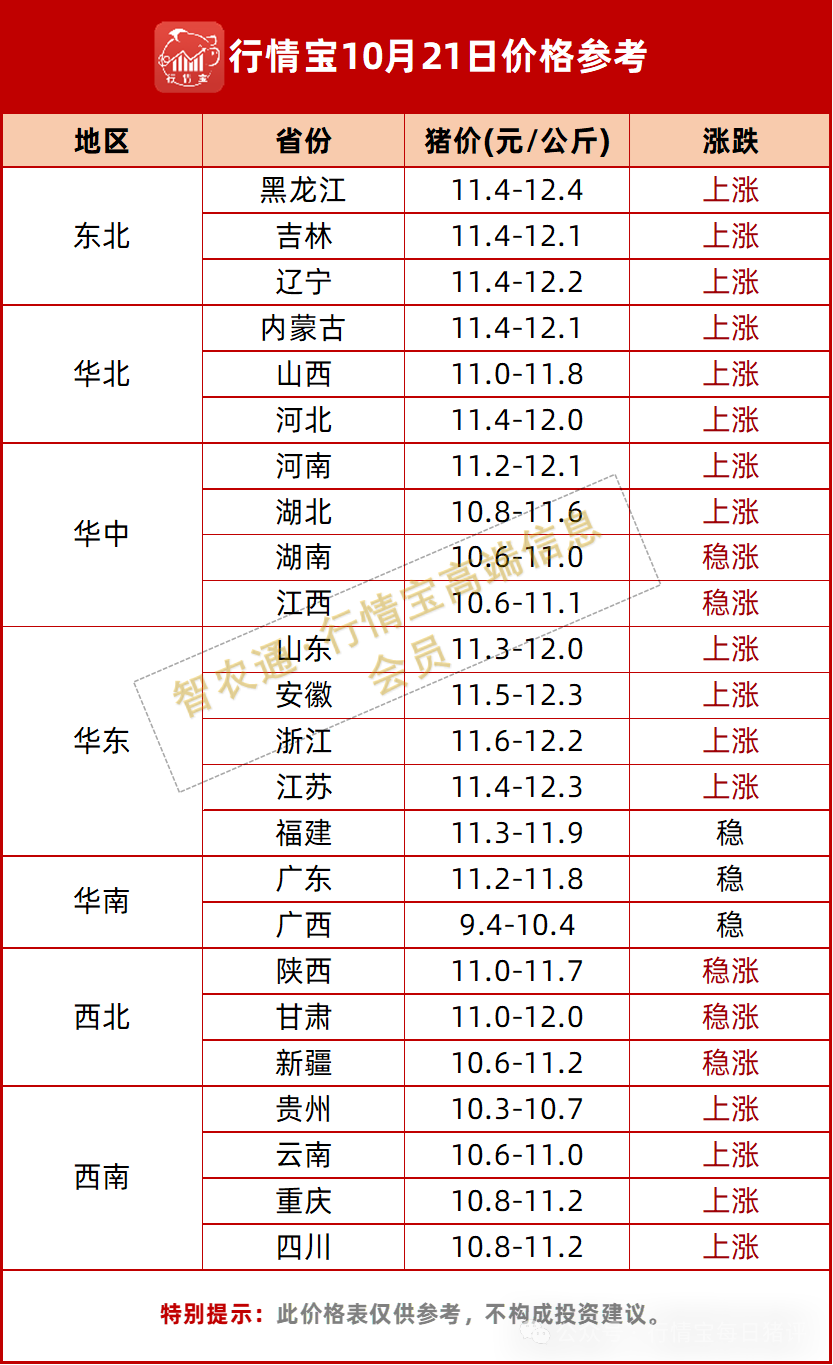 10月20日智农通 APP行 情宝数据显示,今日全国生猪均价为11.26元/公斤,与昨日相比上涨0.11元/公斤,月环比下跌11.34%,同比下跌35.1%。猪价明显上涨。